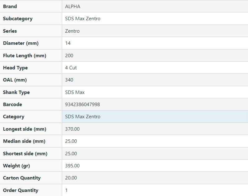 SDS Max Zentro 4-Cutter Masonry Drill Bit - 14mm OAL.340mm FL.200mm