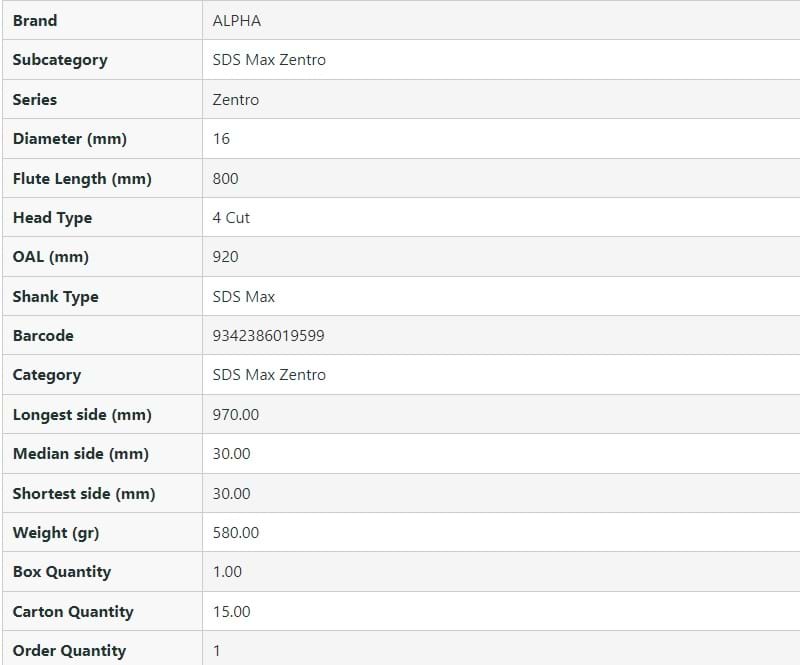SDS Max Zentro 4-Cutter Masonry Drill Bit - 16mm OAL.920mm FL.800mm