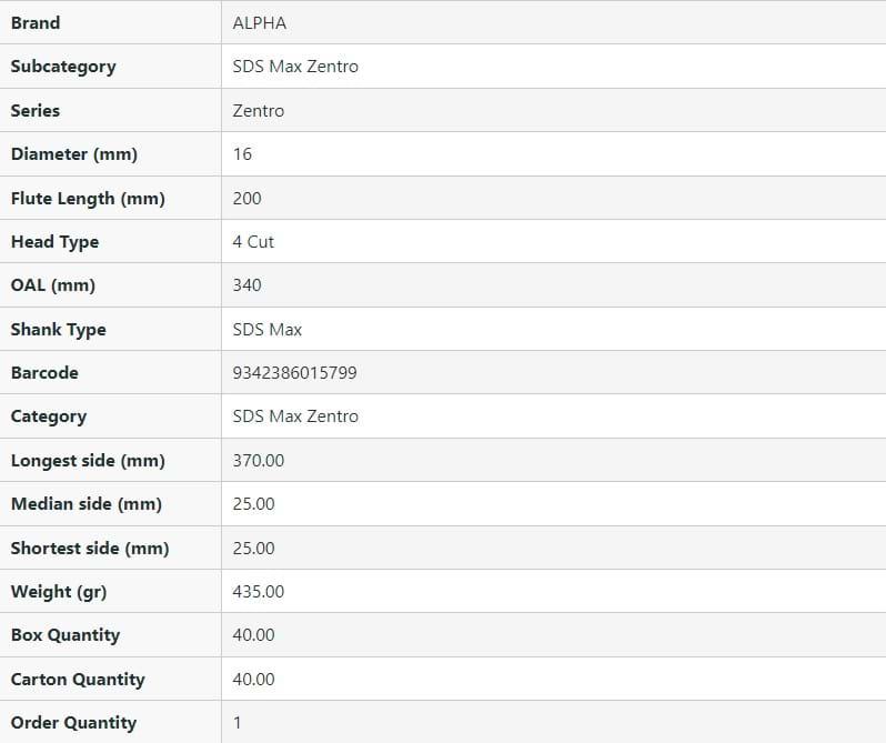 SDS Max Zentro 4-Cutter Masonry Drill Bit - 16mm OAL.340mm FL.200mm