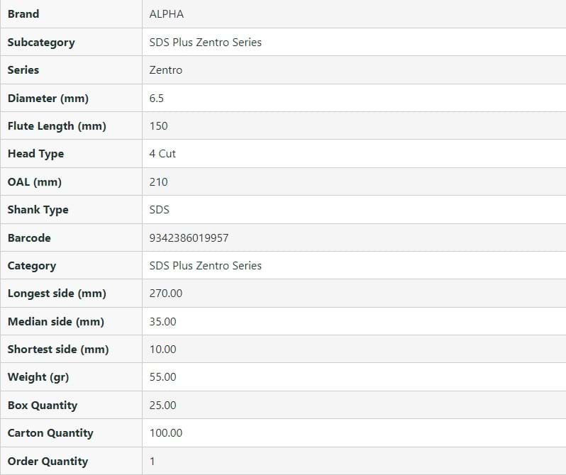 SDS Plus Zentro 4-Cutter Masonry Drill Bit - 6.5mm OAL.210mm FL.150m