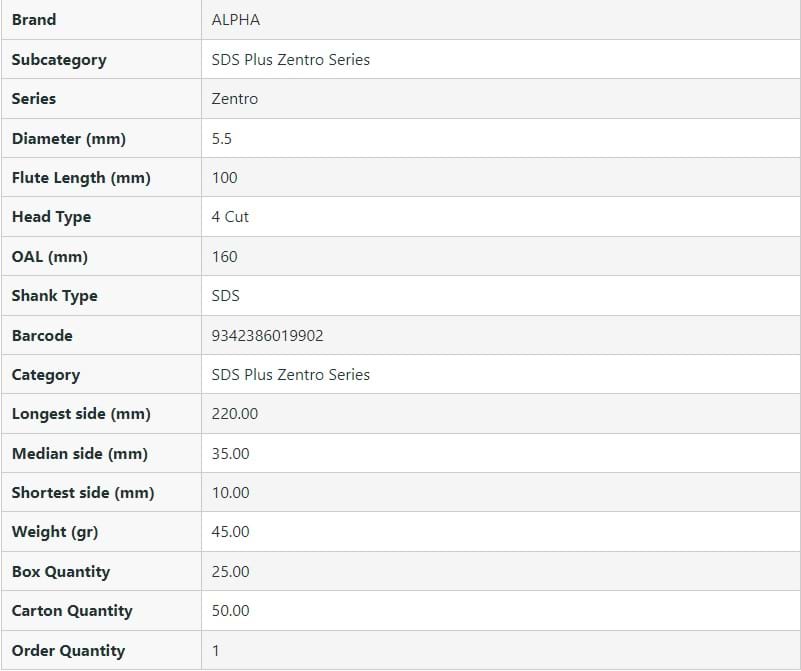 SDS Plus Zentro 4-Cutter Masonry Drill Bit - 5.5mm OAL.160mm FL.100m