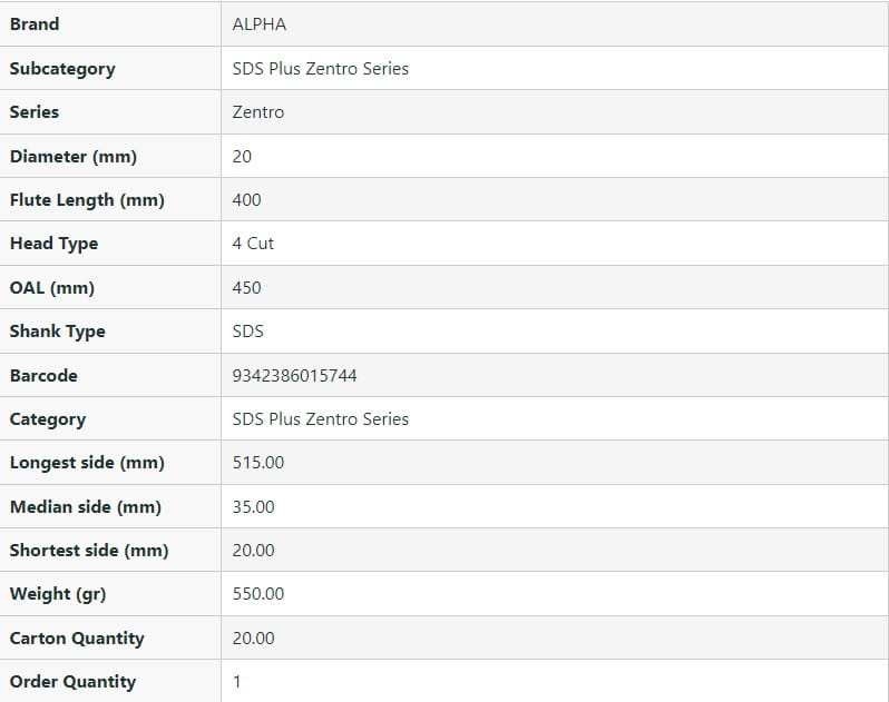SDS Plus Zentro 4-Cutter Masonry Drill Bit - 20mm OAL.450mm FL.400mm