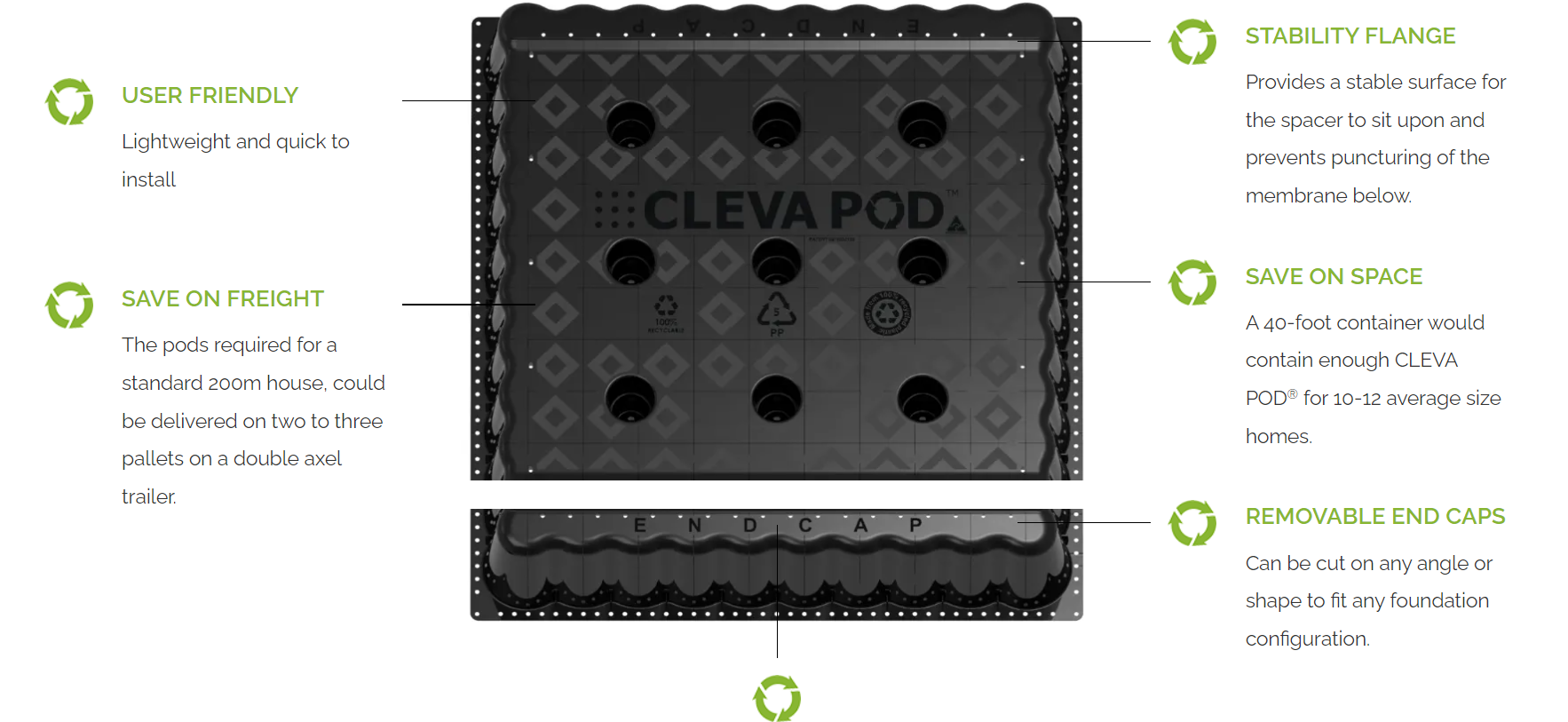 Sustainable Material: Manufactured entirely from recycled and waste polypropylene, CLEVA PODs® are fully recoverable and recyclable, significantly reducing landfill waste compared to traditional polystyrene pods.