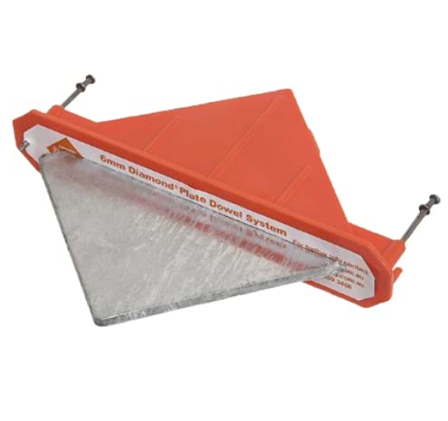 Diamond dowels are suited for construction joints in concrete slabs and pavements. They transfer vertical loads across the joint and minimize differential deflection between adjacent slab panels under load. The plastic sleeves are simply nailed directly to the formwork prior to pouring. Once the initial pour has set and the formwork removed, the sleeves can be inserted into the sleeves prior to the second pour. Black plate dowels are typically used in internal construction joints, whilst galvanized ones are used for external applications.