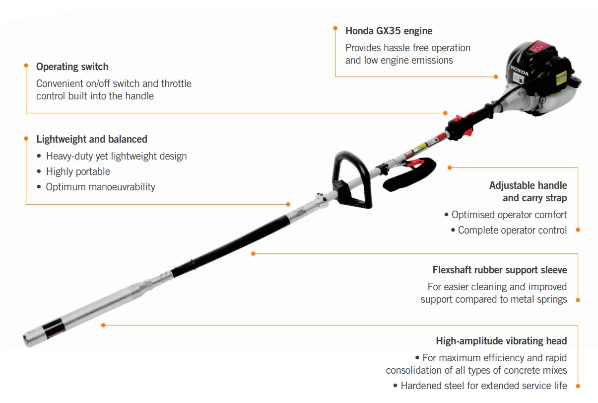 - High-amplitude vibrating head for maximum efficiency and rapid consolidation of all types of concrete mixes