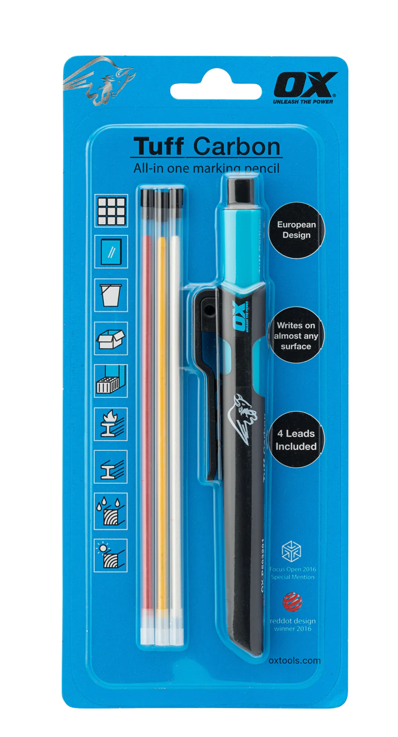 OX Tools Tuff Carbon Marking Pencils are packed with features and are an excellent choice for any tradesman. The unique square design prevents the pencil from rolling off surfaces, unlike traditional round design. This pencil is designed to be able to write on almost any surface on a job site including metal, wood, plastic, brick, stone, block, concrete, glass, tile and much more. It features a belt clip and an integrated lead sharpener built into the cap. The pack comes with four leads, one standard graphite, one red, one yellow, and one white that can be used interchangeably.