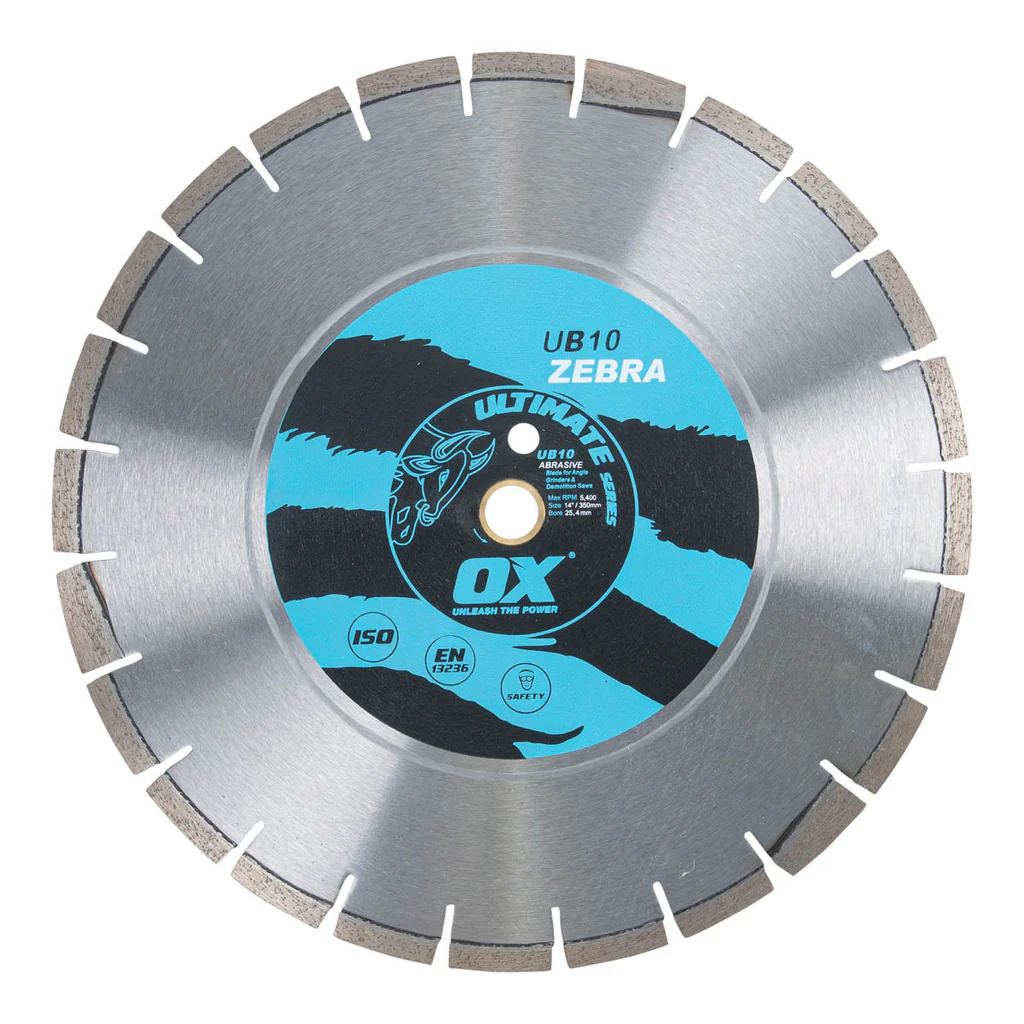 The OX UB10 Ultimate Series diamond blade is a high performance dual purpose blade that is guaranteed to cut all abrasive and general purpose building materials including: concrete products, roof tiles, blocks, concrete and dual concrete/asphalt. Designed for safety, while providing smoother quieter cuts, the robust extra strength center plate helps to reduce vibration while increasing user comfort. The OX Ultimate Series Diamond Blades stand apart from the crowd. They're backed by every safety standard, including ISO 9001 and EN13235. Guaranteed safe. Guaranteed to perform.
