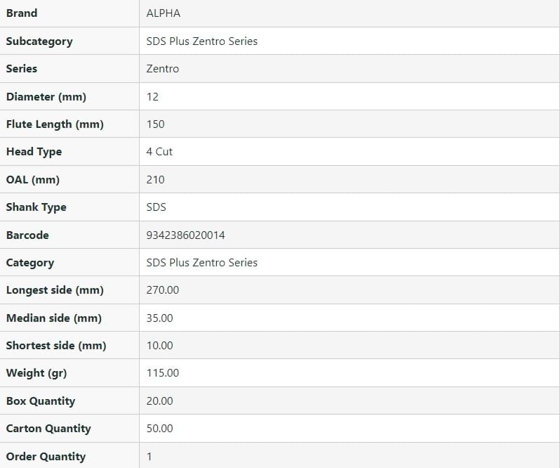 SDS Plus Zentro 4-Cutter Masonry Drill Bit - 12mm OAL.210mm FL.150mm