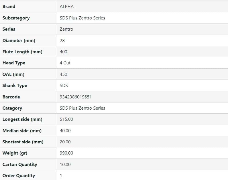 SDS Plus Zentro 4-Cutter Masonry Drill Bit - 28mm OAL.450mm FL.400mm