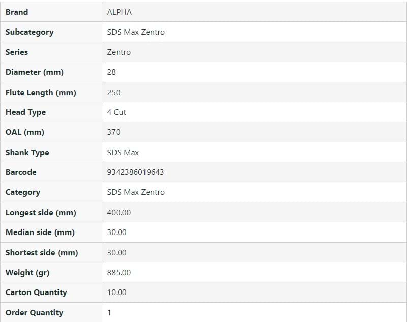 SDS Max Zentro 4-Cutter Masonry Drill Bit - 28mm OAL.370mm FL.250mm