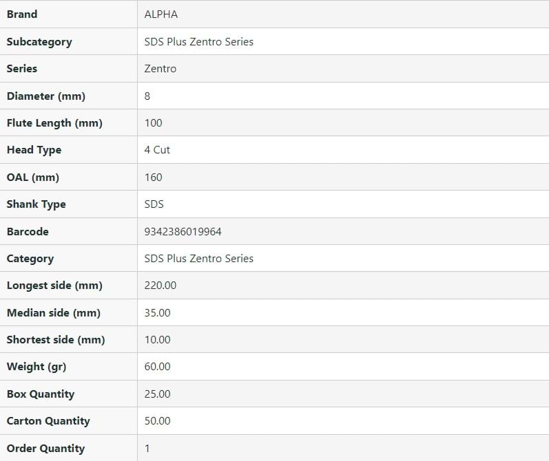 SDS Plus Zentro 4-Cutter Masonry Drill Bit - 8mm OAL.160mm FL.100mm