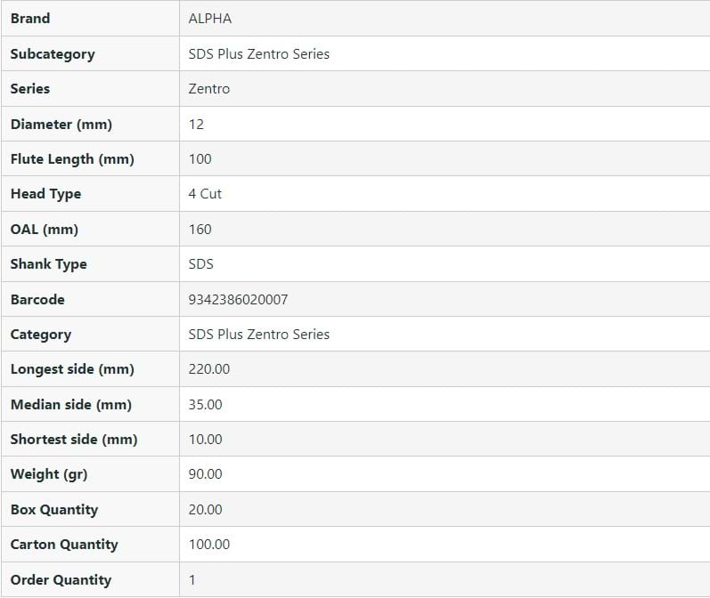 SDS Plus Zentro 4-Cutter Masonry Drill Bit - 12mm OAL.160mm FL.100mm