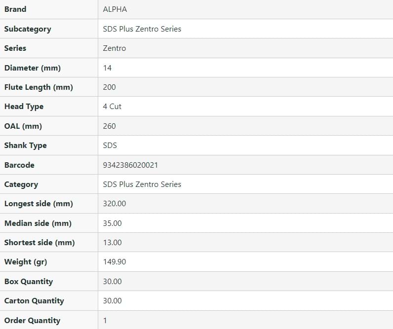 SDS Plus Zentro 4-Cutter Masonry Drill Bit - 14mm OAL.260mm FL.200mm