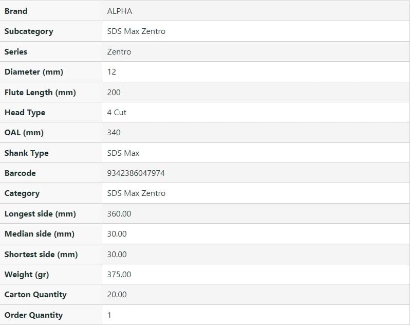 SDS Max Zentro 4-Cutter Masonry Drill Bit - 12mm OAL.340mm FL.200mm