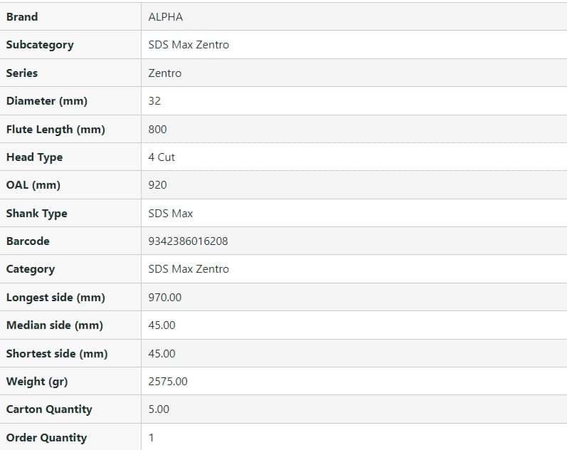 SDS Max Zentro 4-Cutter Masonry Drill Bit - 32mm OAL.920mm FL.800mm